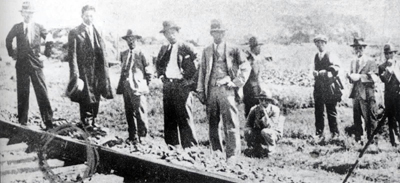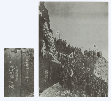日军在“铁路爆炸事件”假证据前:图为日军在破碎的枕木、军帽、枪支等假证据前留影。