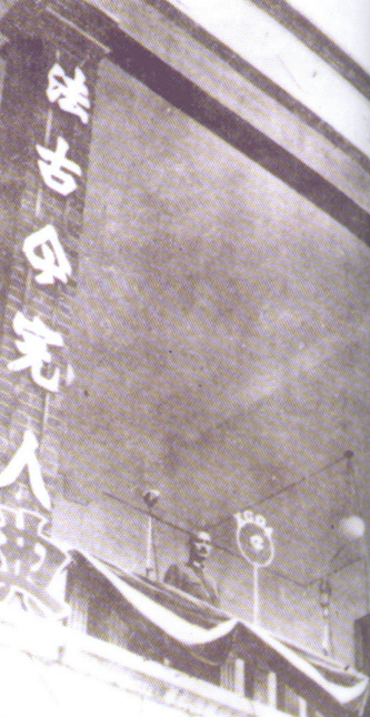 市民们在无奈地驻足观望在某街道上担任警戒的日军士兵