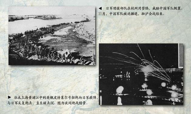 11月,日军占领上海,在南市放火连烧9日,军民死伤无数,上海5255家中国工厂被占,损失超过8亿元。12月13日,日军攻下当时中国的首都南京,进行惨绝人寰的大屠杀,在6周内烧杀淫掠,杀死30多万手无寸铁的中国人,烧毁南京三分之一的房屋。
