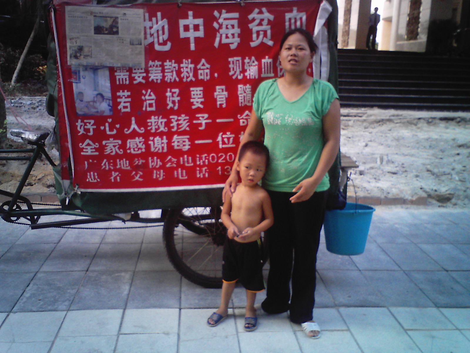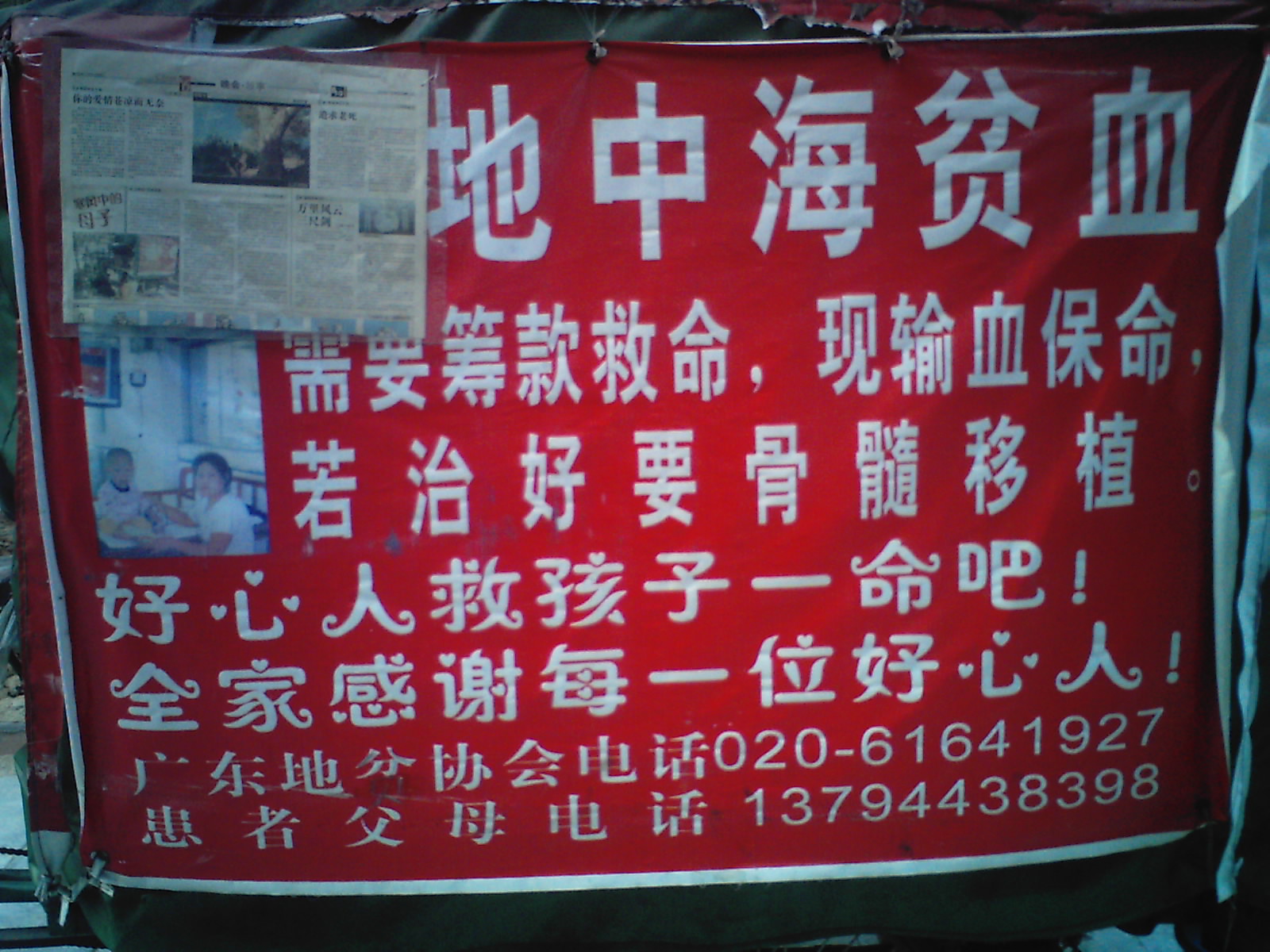 当时我以为是骗人的把戏.后来就停了下来留意观察了很久.而且也从中了解到:3岁半的小男孩得了地中海贫血病,每个月都需要到广州南方医院输血来维持生命.直到能给小孩子做到骨髓移植手术才能治好他的病!维持孩子生命的每个月费用都需要5000元以上,骨髓移植手术的费用要30万人民币.