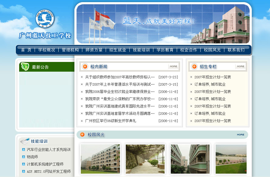 广州市蓝天技工学校是经广东省劳动和社会保障批准设立的,由广州市劳动和社会保障局主管的全日制技工学校。
