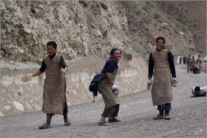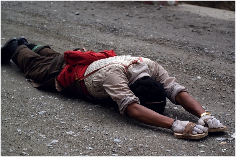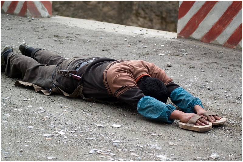第十一天(7月24日)左贡到然乌 7点从左贡出发,8点45到达海拔4400米的邦达兵站。一路上坡,9点15翻越4618米的业拉山口,下坡,对面就是著名的99道拐,大雾弥漫,只能偶然看到对面的路,想拍摄99道拐是不可能了,一路下坡,我不停地做着重复动作,就是向左打方向盘、向右打方向盘,向左、向右、向左、向右……不断重复,快下到坡底的时候,看到十个左右磕长头的藏民,其中三个是女的。我们友好地跟他们打招呼,举起相机示意他们要拍照,他们非常愉快地接受了,我们拍了些照片,把车开到前面等着他们,然后继续拍照,他们从容地磕着长头,接近我们的时候,有几个调皮的青年摆着各种POSE,做着怪动作,让我们拍照,然后还跟我们合影,我们让他们看相机LCD上的照片,他们非常开心。