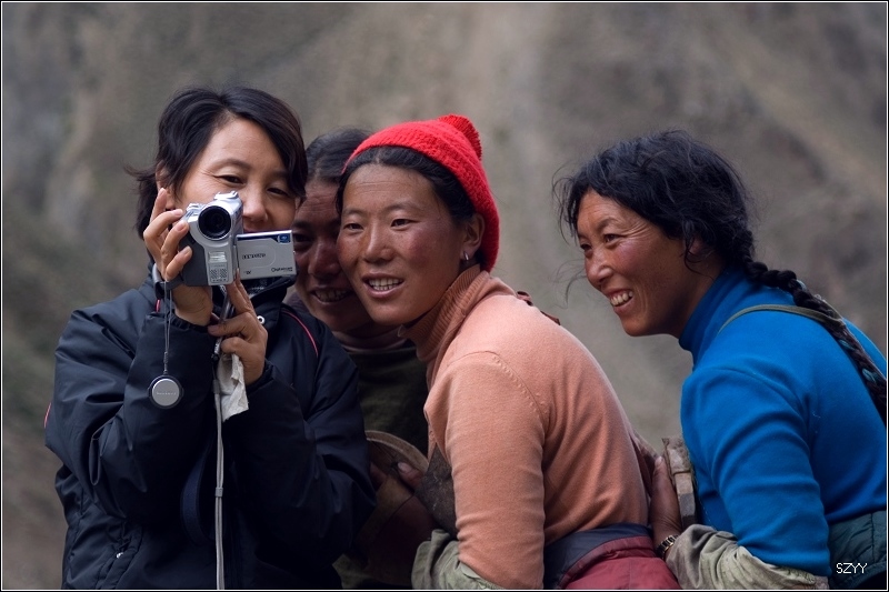 推土机 荣誉会员 荣誉会员 注册 2004-11-28 消息 2,034 反馈评分 0 点数 61 2007-08-23 #231 第十一天(7月24日)左贡到然乌 7点从左贡出发,8点45到达海拔4400米的邦达兵站。一路上坡,9点15翻越4618米的业拉山口,下坡,对面就是著名的99道拐,大雾弥漫,只能偶然看到对面的路,想拍摄99道拐是不可能了,一路下坡,我不停地做着重复动作,就是向左打方向盘、向右打方向盘,向左、向右、向左、向右……不断重复,快下到坡底的时候,看到十个左右磕长头的藏民,其中三个是女的。我们友好地跟他们打招呼,举起相机示意他们要拍照,他们非常愉快地接受了,我们拍了些照片,把车开到前面等着他们,然后继续拍照,他们从容地磕着长头,接近我们的时候,有几个调皮的青年摆着各种POSE,做着怪动作,让我们拍照,然后还跟我们合影,我们让他们看相机LCD上的照片,他们非常开心。