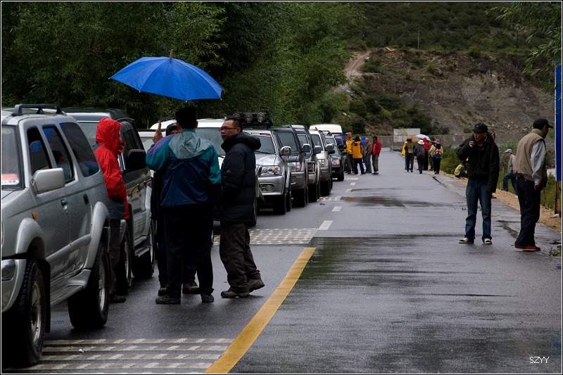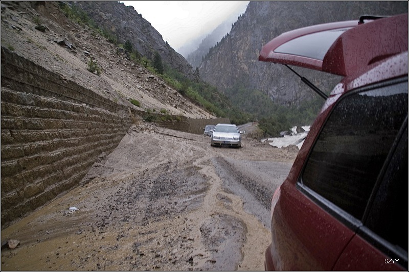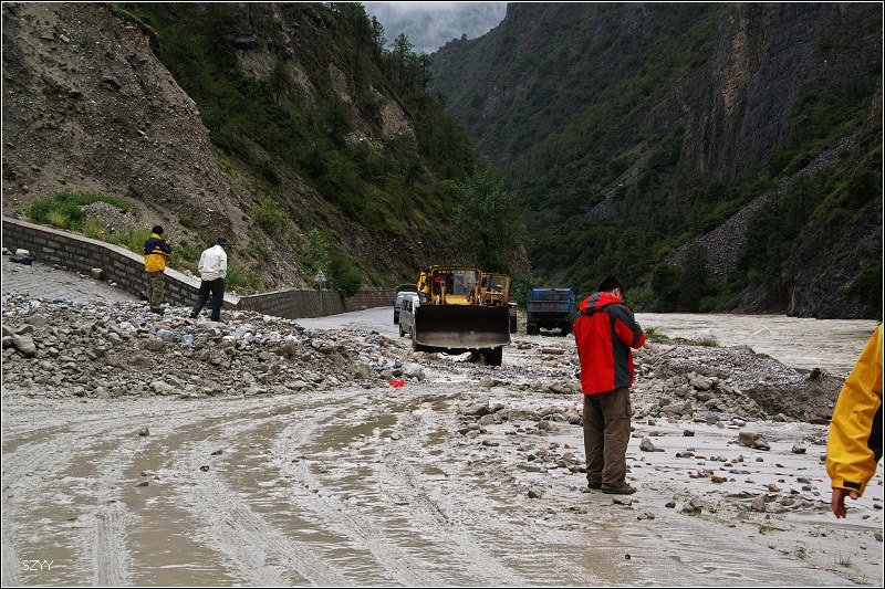 11点10分,早就被我们甩在后面的铲车开过去了,我们重新上路,不久,见到前面堵了一长队汽车,雨已经不下了,大家都在车下聊天,又看到广州光头,还看到从西安来的本田雅阁、陆虎。到前面去打探了一下,有一个栏杆把车都拦住了,前面7km处路被泥石流堵住了。11点40,栏杆抬起来,开始放行,12点05,遇到前面说过的泥石流,虽然铲车已经进行了清理,但还是很难通过.我们小心通过,老曲的车再次被陷住,通过对讲机告诉我们,我们马上退回去,达咏和老严拿出拖车绳,老严跳过去,挂住挂钩,把老曲的车拖了出来。一辆广本和一辆雪佛兰轿车自己开了过来,看来过泥石流一要果断,不能犹豫,二要运气,否则很容易陷车。老曲的车是被一个石头挡住了前轮。