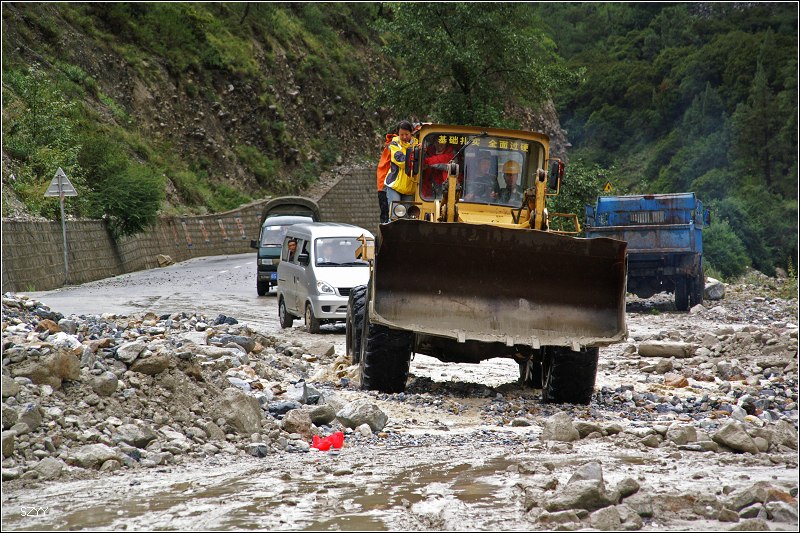 推土机 荣誉会员 荣誉会员 注册 2004-11-28 消息 2,034 反馈评分 0 点数 61 2007-08-26 #307 11点10分,早就被我们甩在后面的铲车开过去了,我们重新上路,不久,见到前面堵了一长队汽车,雨已经不下了,大家都在车下聊天,又看到广州光头,还看到从西安来的本田雅阁、陆虎。到前面去打探了一下,有一个栏杆把车都拦住了,前面7km处路被泥石流堵住了。11点40,栏杆抬起来,开始放行,12点05,遇到前面说过的泥石流,虽然铲车已经进行了清理,但还是很难通过.我们小心通过,老曲的车再次被陷住,通过对讲机告诉我们,我们马上退回去,达咏和老严拿出拖车绳,老严跳过去,挂住挂钩,把老曲的车拖了出来。一辆广本和一辆雪佛兰轿车自己开了过来,看来过泥石流一要果断,不能犹豫,二要运气,否则很容易陷车。老曲的车是被一个石头挡住了前轮。