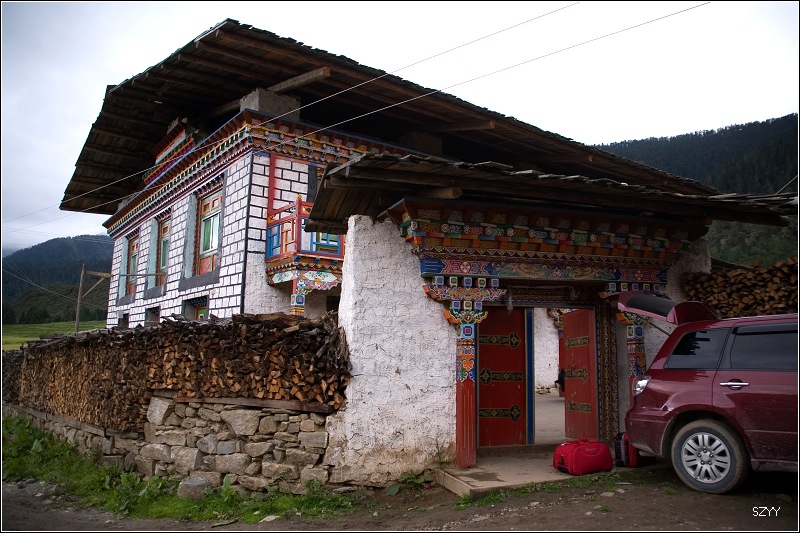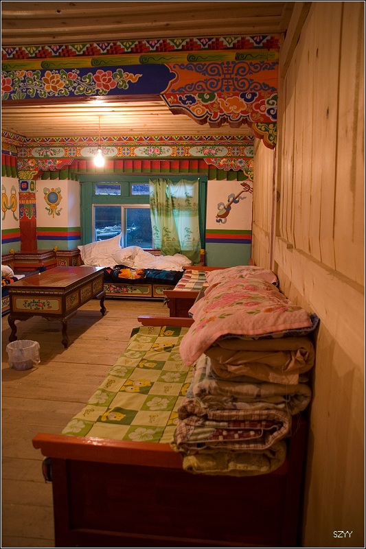 8点半,路过属于鲁朗的扎西岗民俗村,里面可以住宿,老曲和关老师联系好了住的地方,我们在次仁家吃了晚饭,在院子里遇到几个深圳来的小姑娘在聊天,她们是从成都包车进藏的。次仁以前当过村长,汉话讲的很流利,现在开家庭旅馆,女儿在拉萨酒店做前台服务,外孙女在拉萨读书,放假回来帮外公招待旅客,小姑娘很精明,跟他外公一样,饭吃的不怎么样,可是说良心话,价钱很贵,尤其是"藏香腊肉",百分之百的肥肉,我们基本上是没动筷子,但是价钱占了整个晚餐的一半。次仁家的房子很大,很漂亮。吃完饭,次仁安排我们住到尼玛次仁家。洁白的被褥,很干净,晚上睡的很好。