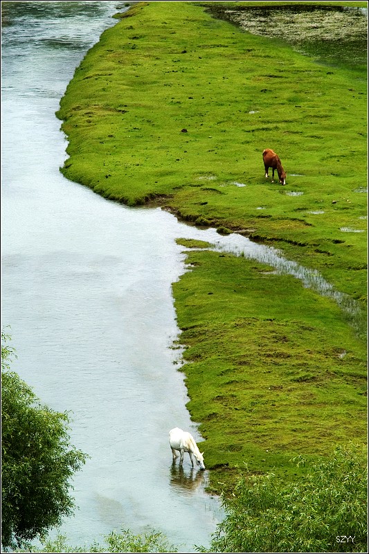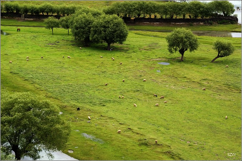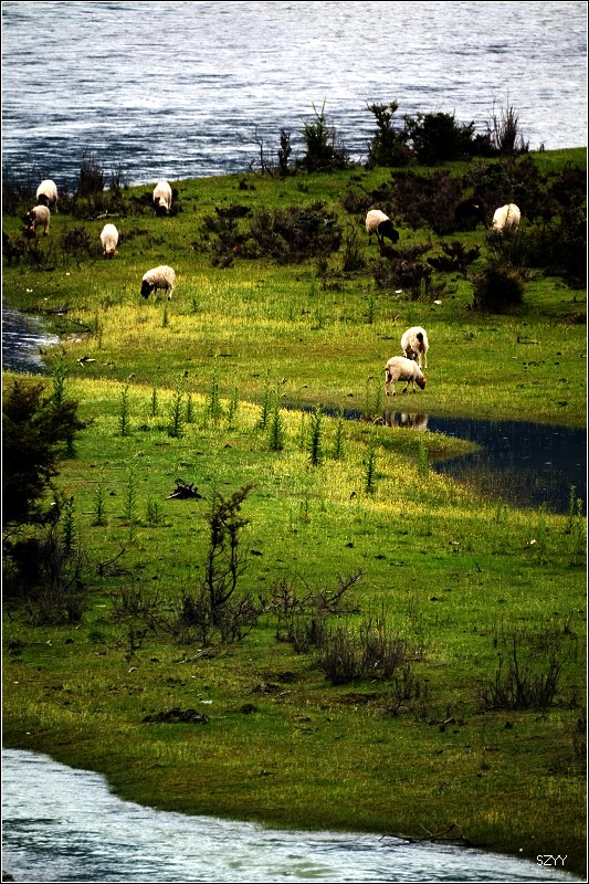 从世界柏树王园林出来,路边有卖水果的,我们买了些香瓜,沿路找到一个风景比较好的地方,停下来,边欣赏风景,边吃瓜。 垃圾我们可没有乱扔,我们一路上都在车里放着垃圾袋,垃圾全部入袋,并且,据说藏民视鱼为圣物(或者是说湖里的鱼),我们在进藏区之前就达成共识――进藏不吃鱼。所以在藏区,我们一直都没吃鱼。