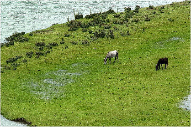 我们拍照的时候,周围有一些藏族小孩子要东西,我们一路上已经把车上的书本文具分发完了,还有一袋文具图书放在老曲的车尾箱里,老曲已经单车先走了。也许是因为这个景区来的游客比较多,跟此前我们遇到的孩子们相比,这些小孩已经不那么淳朴了,在我们的车上到处找东西,甚至拉开我们车的后尾箱,很无奈。继续前行,到达尼洋河和雅鲁藏布江的交汇处,尼洋河的清水和雅鲁藏布江的浑水相交,水线很明显。前面已经不好走了,坐船去雅鲁藏布大峡谷每人要500元,来回几小时,已经比较晚了,而且天气不好,不好拍片,另外我们的车放在这也不安全,所以还是不去看峡谷了,开车赶回林芝。