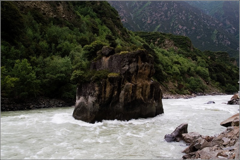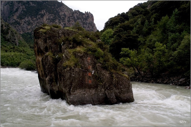 7点10到工布江达,我们把备用油桶的油全部加到油箱里,开了十多分钟,到达尼洋河的著名景点中流砥柱,刚拍了两张照片,就下起大雨。