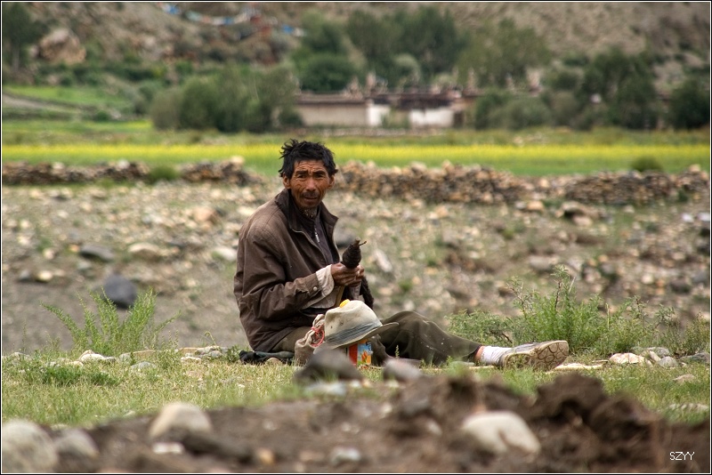 沿路看到不少山头上有类似经幡的柱子,而且有藏民在那里坐着聊天、喝酥油茶。