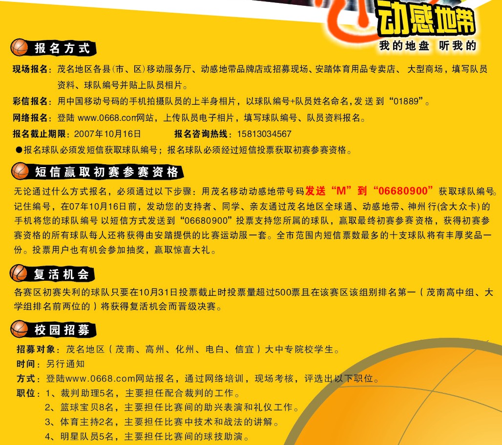 L lin_jump 幼儿园 注册 2007-06-12 消息 26 反馈评分 0 点数 0 2007-10-09 #1 电白动感地带三人篮球赛即将拉开序幕! 奖金高达1500元,还有安踏公司提供的价值588元的运动大礼包!快快来参加啦! 详情请咨询当地移动服务厅;或加入QQ群:48305540 附件 篮球1.jpg 132 KB · 查看: 337 篮球2.jpg 296.8 KB · 查看: 322 篮球3.jpg 129.7 KB · 查看: 316