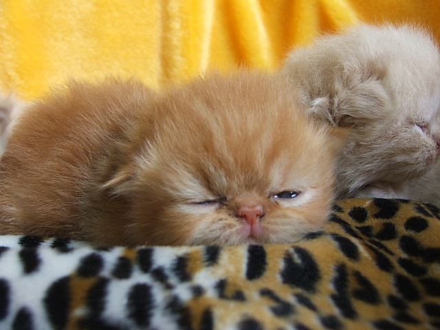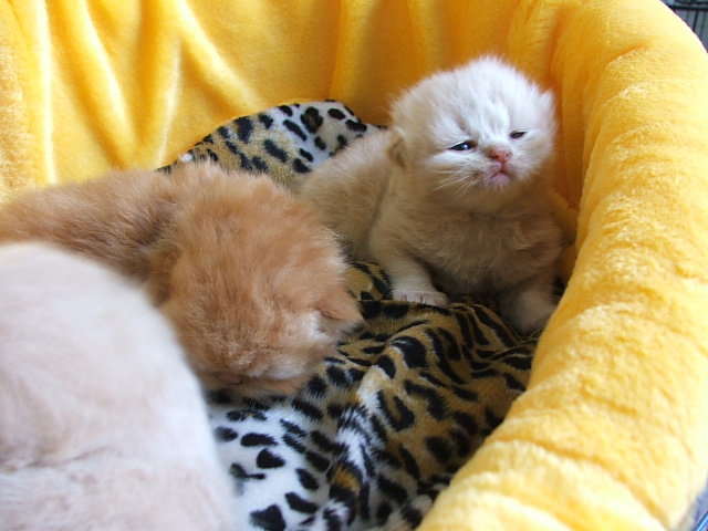 小猫们现在十来天大.眼睛也张开了几天了.胖胖圆圆的小家伙.小猫最可爱就是这个时候了!把照片发上来和大家分享一下!