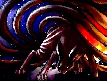 日本神话原型:日本神话里最强的S级妖兽,为赤红色,代表火之力量,其能力巨大,由于是唯一一只从来没有被打败过得妖兽,其潜在力量无法估计,攻击方式为使用其接近无限 的查克拉转动9条尾巴(什么意思,电风扇?),任何K近的生物都会被9条尾巴所产生的强大风力吸过去,然后再被妖狐可变大的巨爪撕碎。同时浑身毛发可放出无限次火元素类似陨石的攻击,可以瞬间毁灭城市。上古神兽战中,将挑战得彭侯打成重伤,猫又如不是被其主人死神救走,几乎丧命,而八娱大蛇则依K草雉剑勉强全身而退,草稚剑也被打裂一个小缺口 。