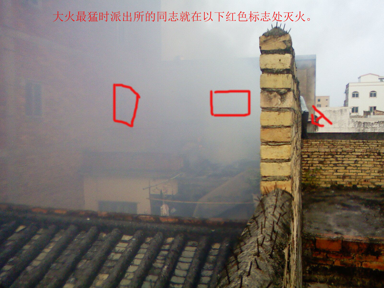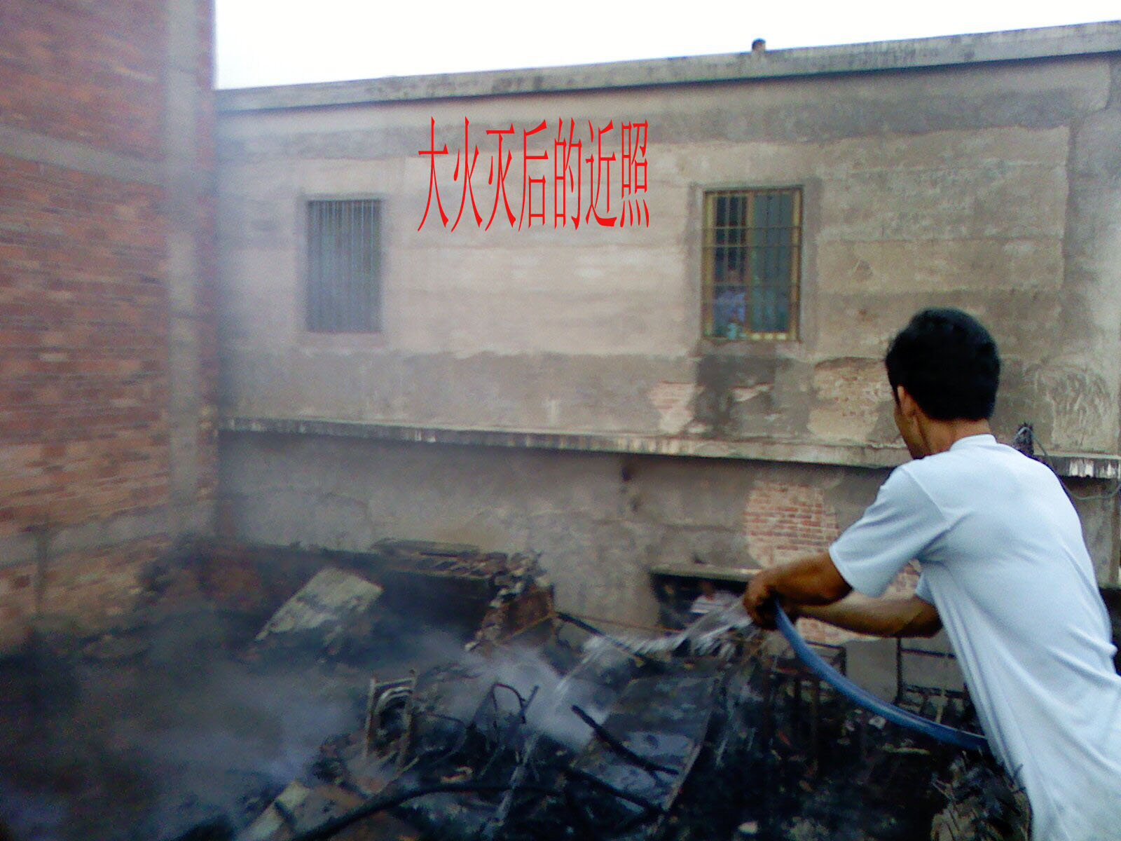 由于大火最猛时,而且火中有煤气瓶,派出所同志不准我靠近,所以灭火最紧张时我只能在远处照子一张。就是这张,所以烟火将派出所的同志湮没了。