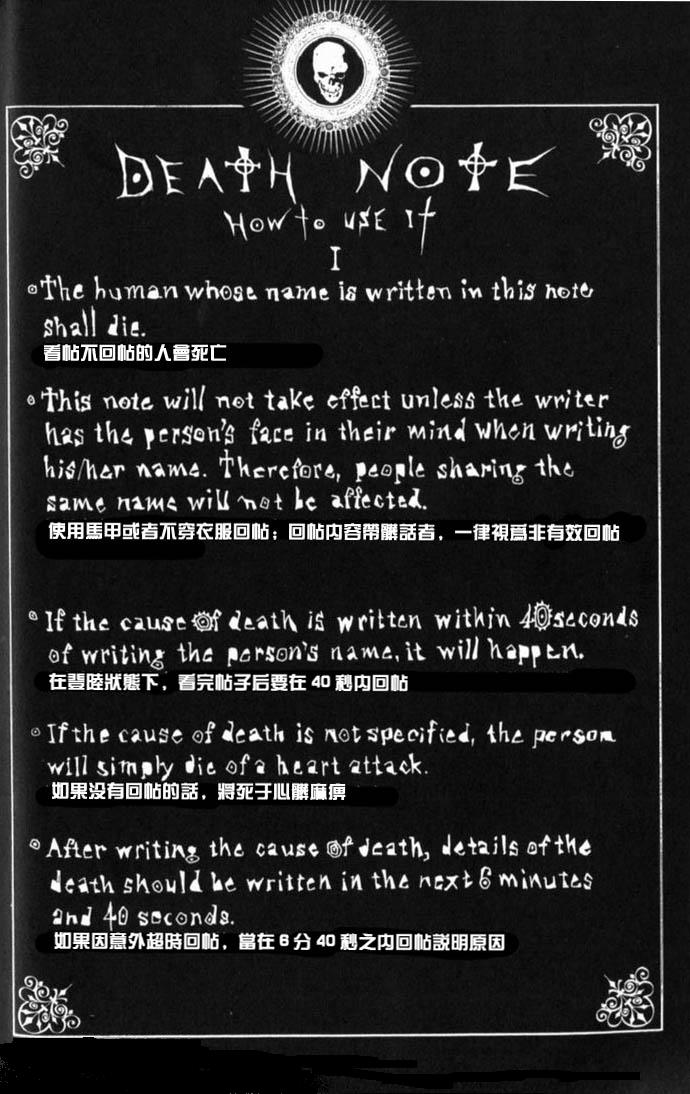 ・看帖不回帖的人会死亡。 ・使用马甲或者不穿衣服回帖,回帖内容带脏话者,一律视为非有效回帖。 ・在登陆状态下,看完帖子后要在40秒内回帖。 ・如果没有回帖的话,将死于心脏麻痹。 ・如果因意外超时回帖,当在6分40秒之内回帖说明原因。 超强的《死亡笔记》新解!!!!笑死我了……XDDDD 记住喔~不回帖的人会死亡!
