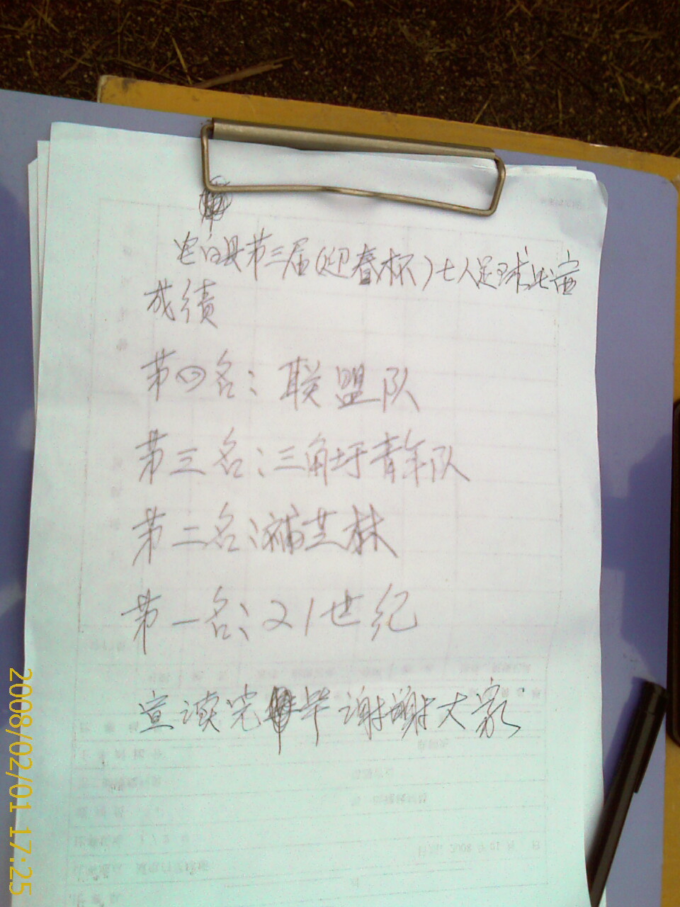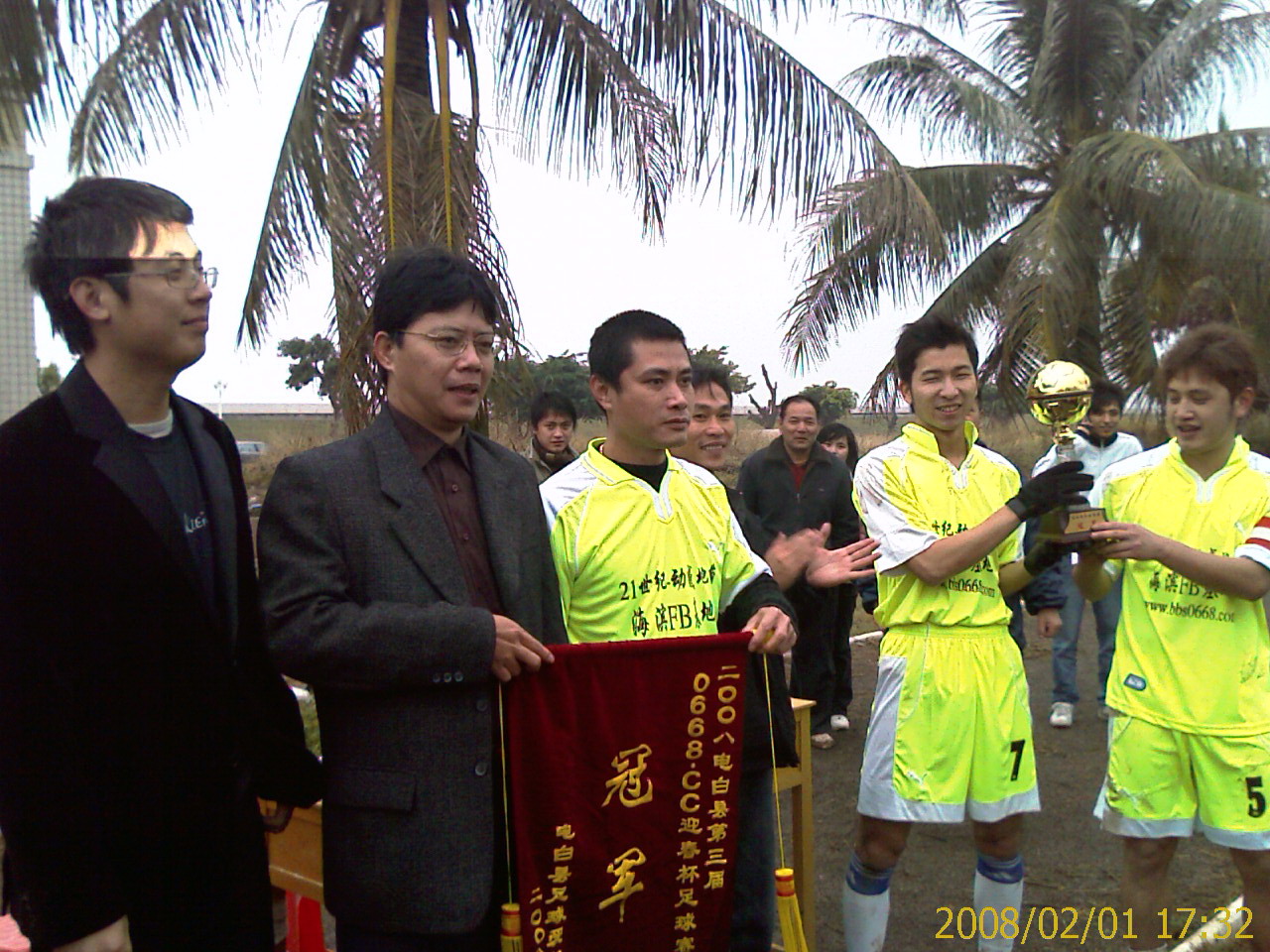 郭靖 荣誉会员 荣誉会员 注册 2007-05-16 消息 2,343 反馈评分 0 点数 61 2008-02-01 #231 2008年第三届“0668.CC迎春杯”足球赛成绩 冠军 21世纪足球队 亚军 补芝林食庄足球队 季军 三角圩青年足球队 殿军 WIFI联盟足球队 最隹射手 两名:林福炳 蔡海