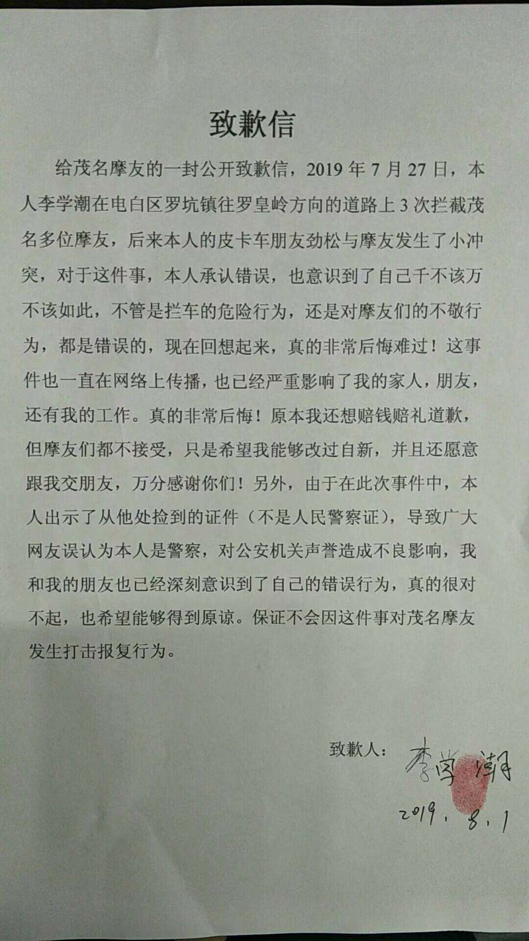 作为路过者,我说说我的目击现场。我驾车在罗坑水库小水路段,突然几辆大台摩托车在转弯处超了我的车,我减速让他们过了,心想这样骑车,迟早出事。又走了几公里,前面车堵了,我打开车窗往前看,发现一帮人在争吵。由于我赶时间,就下车看看究竟,原来是那帮摩托车队的人跟丰田车、皮卡车的人激烈争吵,并发现一辆大台摩托车停在最前面,堵住丰田车,丰田车后面又是一辆大台摩托,再到皮卡车,左边路又停了几辆摩托车。摩托车队有人拿手机拍摄,其中一个年轻点的大声说:找律师、公安局长搞死你们,以后别在茂名市区出现。另一方也在吼:你拍摄侵犯了我们的肖像权,必须删除。你吼我,我吼你……,当中也有人在劝双方各让一步,最后摩托车队的人驾离了车,道路恢复通畅,事情才平息,没有发生打人行为。我看了楼主发的视频和其他微信群的视频,原来摩托车队超我车后,不久便与丰田车、皮卡车发生了矛盾,摩托车有涉嫌危险驾驶,丰田车、皮卡车有涉嫌滥用职权解决私人怨气,双方各打五十大板!都是不省油的灯!在此劝告各位,出门在外,宁可停一分,不争一秒,遇大事化小事,小事化没事,平安出去,高兴回来!网络不是法外之地,不信谣,不造谣!