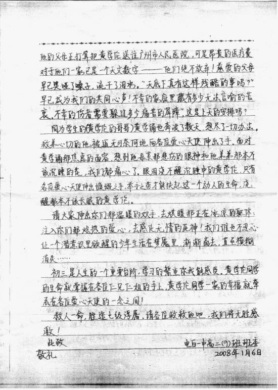 来自电白县沙琅镇尚塘管区新寨村的一户小家庭的求救, 2008.1.1,就读电白中学初三(7)班的黄学伦同学,在回家的路上,遇到车祸
