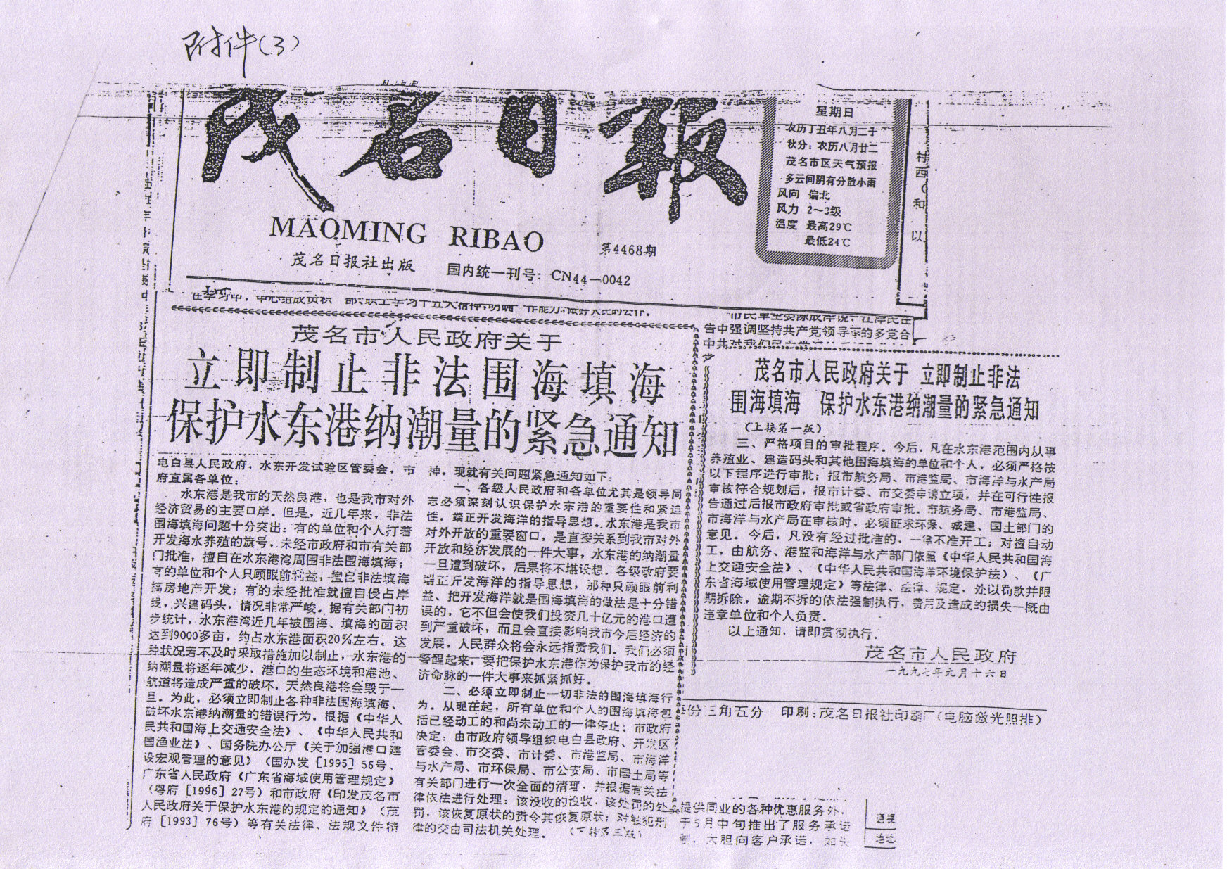 电白县海滨开发区为了海滨新区的开发,在1992年前后二、三年期间可一手遮天地不顾国家法律法规,声势浩大地围海、填海几百公顷,能用公、检、法压阵强征农民水田耕地几千亩。可想而知,当时的地方农民百姓对政府的所作所为也只能敢怒而不敢言,如果不是因为填海的后果致使1996年15号强台风给我村渔民带来一场大灾难的话,如果不是因为电白海滨开发区用公权侵占我村的集体财产又不给补偿的话,又何引来我村村民的集体上×呢?我村村民为了讨个公道,为了讨回合法权益,也为了今后村民的长远生计,为了保护本村的天然良港和港湾滩涂,在这10多年来多次地集体上×了茂名市委市政府和省委、省政府。茂名市人民政府的批复是:“电白县所有单位和个人必须立即停止一切非法围海填海行为(见附件(2)茂府函[1997]22号。”1998年10月10日广东省委的批示是:“电白县政府处理,处理情况要书面回复省委。”2006年6月6日省政府又将我们的上×事件列为全省通报。但在电白一贯是上有政策,下有对策,先斩后奏,什么国家法律、上级政令都不屑一顾、不畅通,所有大问题、大事件都是不了了之!我们弱势贫民想维权,想讨公道,真是比登天更难!更加可恶的是,目前,电白县政府又正在继续实施非法围海填海工程。