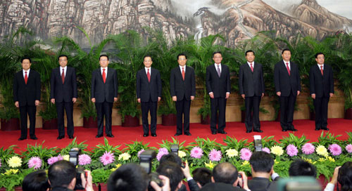 刚刚在党的十七届一中全会上当选的中共中央总书记胡锦涛和中央政治局常委吴邦国、温家宝、贾庆林、李长春、习近平、李克强、贺国强、周永康在北京人民大会堂同采访十七大的中外记者亲切见面。新华社记者 高洁摄