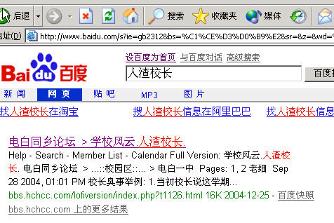 今天想搜索一下廖校长的名人好事,在全球第一大中文搜索引擎试试输入廖有光,搜索的结果真是大吃一惊。 [attachmentid=9527] 再试试搜索人渣校长,哇!!大跌眼镜啊 [attachmentid=9528] 此论坛真的能让人一夜之间成为名人