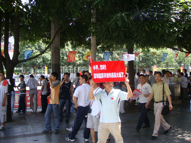 QUOTE(allcombest @ 2008年05月09日 Friday, 12:15 PM) 大家都有等得很辛苦啊! [snapback]2229251[/snapback] 传递线路 --- 市民中心南广场(起跑仪式)→福中三路→益田路→深南大道→华侨城→深圳科技园(休息)→南海大道→深圳大学→创业路→后海大道→南山第二外国语学校(午餐)→滨海大道辅道→后海滨路→海德三路→海德四路→文心五路→滨海大道→滨河大道→福田体育公园(休息)→宝安南路→深南路→上步路→笋岗路→体育中心西广场(庆典晚会) 大清早在市民中心就挤满了人,起跑仪式推迟了2小时在中午12点08分才开始. 共208名火炬手,每人跑200米. 很遗憾的是在中午13点左右,临时取消了以下路线:创业路→后海大道→南山第二外国语学校. 久久在后海大道那里等候的人们抱怨,不满,闹情绪,用矿泉水砸.