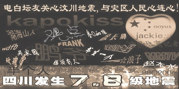 天佑中国,人间有爱。朋友们,无论你们身边有任何的条件,只要是能帮助灾区的,希望我们都马上付之行动,莫以善小而不为,一篇文章,一元捐款,都是一种支持,2008注定是荣耀与灾难交辉的一年,灾难的是中国人的土地,荣耀的是中国人的心。