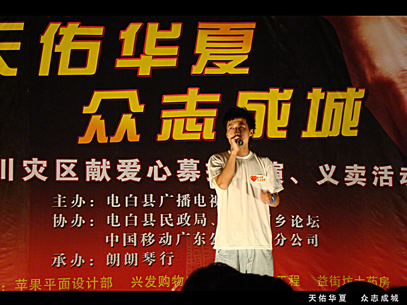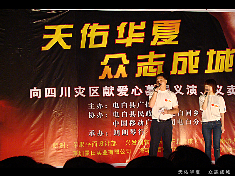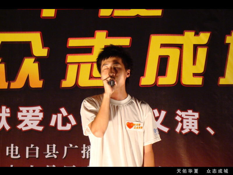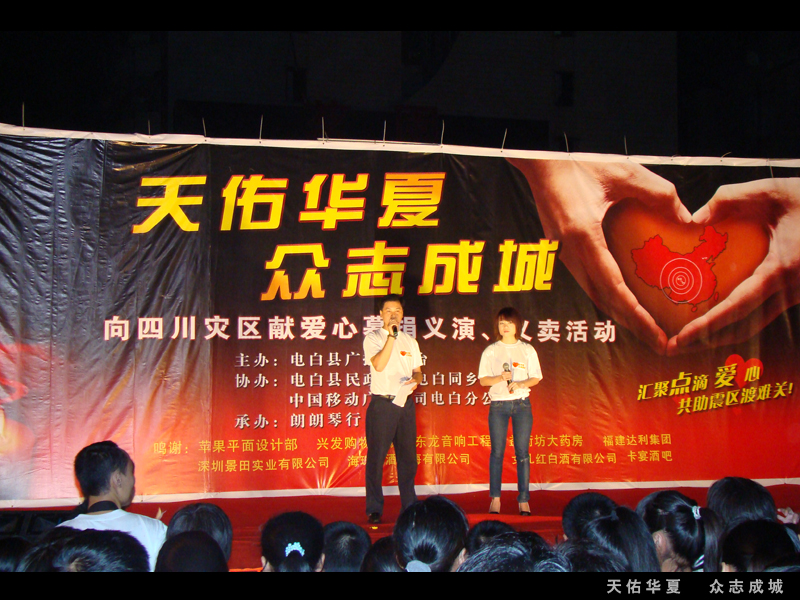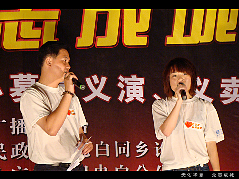 转转折折,以为这场义演就要夭折了。在22号才确定23号就能举行。如此仓促还能有如此效果,多亏各位网友的支持。在这要特别感谢几个网友的支持的,没他们可以说这晚会无法进行的。老V,蛙子,奶茶。在这我也代表不了谁,我代表我自己先感谢你们。我知道你们的付出不比我少的!当然还要感谢这场义演的所有演员,所有义工!所有对这场义演出力的朋友! 感觉有很多话想所,苦于文采不好。就不再罗嗦了。 救助灾区重建是一项长远的计划,需要的不止是这一两场义演,需要的是坚持!坚持!再坚持!