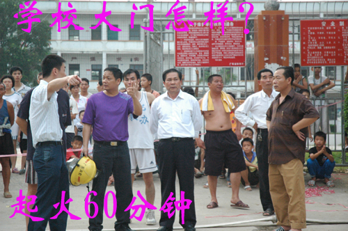 “一楼面对大衙中心小学的铁门被烧炸得严重变形。”胡说八道。上图左边的楼房比学校门口还近几米,还是白白净净的,火怎会去烧远处的铁门,吃饱撑的?从起火到火被扑灭,我一直在现场。学校早就放学了,哪还有几个学生?县长几乎是同消防队一起到达,县长到的时候火已经烧四五十分钟了,谁疏散谁?那天没有风,黑烟只向上滚,周围的建筑损伤并不严重。
