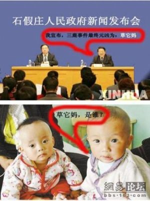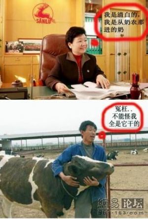 另据CCTV报道: 我们向有关专家咨询产生的原因:通过对产品大量深入检测排查,在8月1日,得出结论:是不法奶牛向鲜牛奶中掺入三聚氰胺造成婴儿患肾结石,不法奶牛才是这次事件的真凶。目前,公安机关已开始抓捕添加有害物质的不法奶牛,追究其法律责任。 [2]关于三鹿奶粉事件的最新报道: 目前国家把责任推给三鹿,三鹿把责任推给奶农,奶农把责任推给奶牛,警方正全力抓捕不法奶牛。据报道,责任奶牛已携二奶潜逃,仅捕获一小撮不明真相的牛群。目前母牛们情绪稳定。。。。。另据最新消息,水牛和蜗牛已通过半岛电视台发表声明声称和此事件无关。