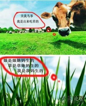 三鹿说是奶农的责任,奶农说是奶牛的责任,奶牛沉默,支吾出了一个字----草!草很委屈,流着泪说,要怪就怪我妈生了我,终于抓出了事件元凶―――草它妈!” [attachmentid=187706] [attachmentid=187707] [attachmentid=187708]