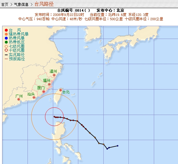中央气象台2008年9月22日18时发布台风橙色警报: