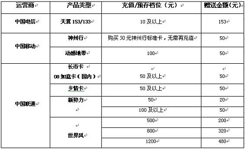分析三家运营商近期举办的送话费活动,天翼153/133入网,购买10元的充值卡,即可获得153元的话费大礼包,返还比例最高达15倍。神州行买50送50;动感地带买充值买100送50。联通的各种卡中只有长市卡和乡情卡达到了预存和赠送话费相等外,其他卡均未达到返回比例百分之百。