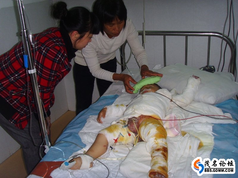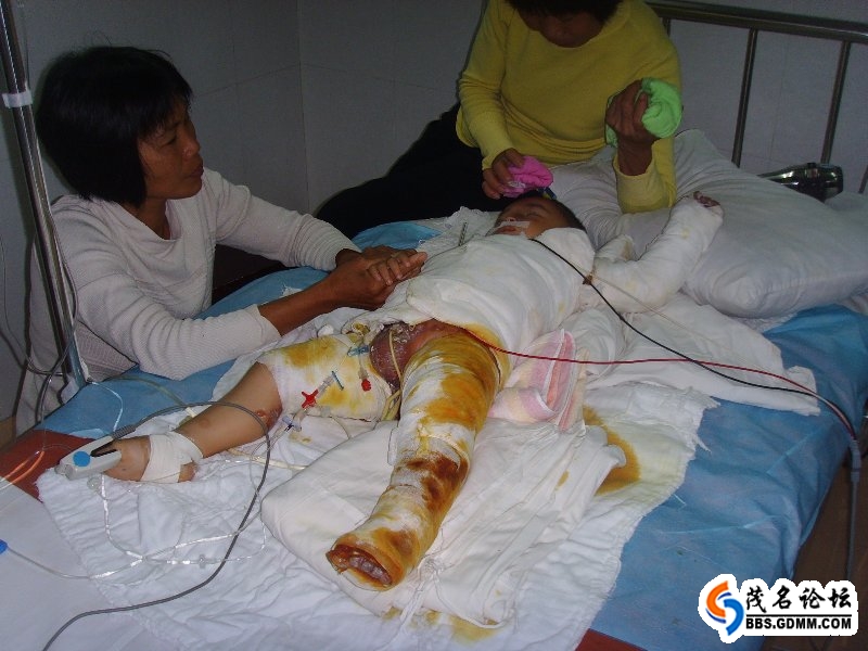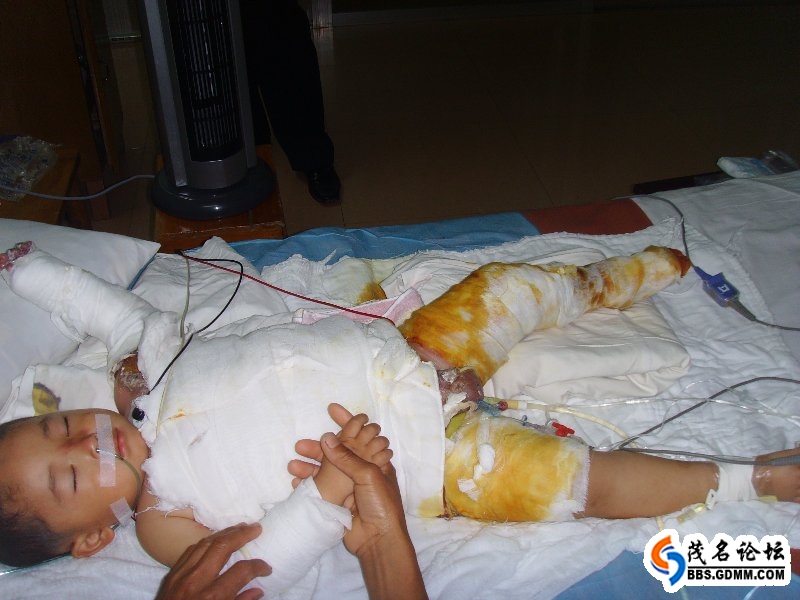 (转贴)23日下午,茂名市人民医院收治了一位这样的患儿:男,3岁左右,头部以下几乎全被烫伤,占全身皮肤面积超过60%,入医时昏迷。医院的医务人员及病友,无不伤心动容(在此对人民医院表示敬意,可能在别的医院已被拒收)。
