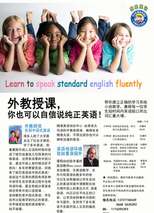 精 精准英语 幼儿园 注册 2009-07-29 消息 17 反馈评分 0 点数 0 2009-07-29 #1 美国白人外教 真正纯正口音 轻松幽默的教学方式 让你的学习迅速提高并充满乐趣 教材有中文翻译有 本中心有中英文老师协助 不必担心听不明白 QQ 1176295393 电话 13727740439 附件 post.jpg 92.2 KB · 查看: 717