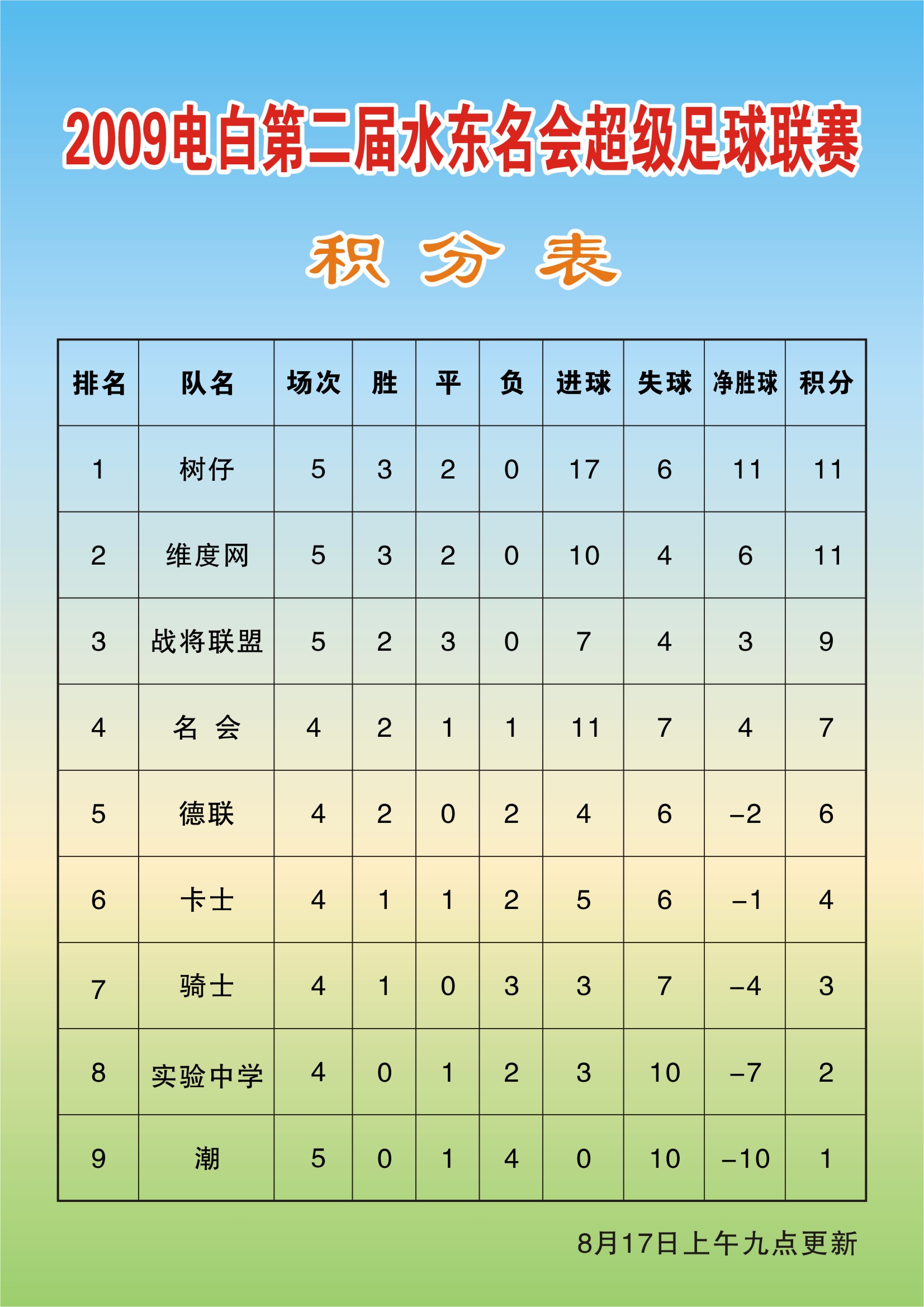 感谢你的努力和付出 在这提醒下 树仔队的净胜球你算错了 进17 失6球 应该净胜11球吧 而不是9球 希望更正 谢谢