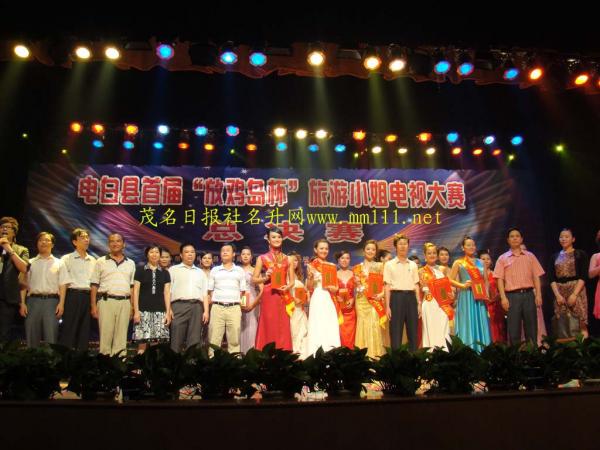 历时几个月的电白县首届“放鸡岛杯”旅游小姐电视大赛总决赛于8月26日晚在电白县人民大会堂圆满降下帷幕。 在26日晚举行的总决赛上,由半决赛中脱颖而出的16名佳丽经过一番争奇斗艳,各项桂冠均已产生。本届的冠、亚、季军均由电白本地佳丽获得,她们分别是许斯慧、李敏、梁春晓,伍一丹获得“最上镜小姐”奖、谭丽婷获得“最具智慧小姐”奖。