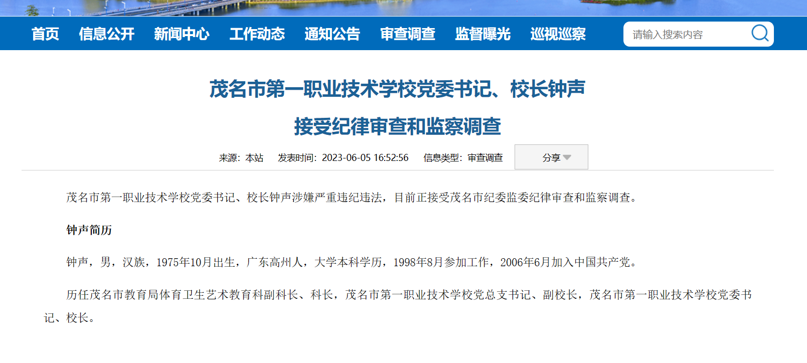 廖建诗是茂名市教育系统近一个月落马被查的第4位处级干部,其他三位分别 第一位:4月22日被查处的茂名市第一中学党委书记、校长洪喜亮 第二位:5月18日被查处的茂名市第一中学党委委员、副校长李文坤 第三位:5月20日被查处的茂名市教育局党组成员、副局长李杰
