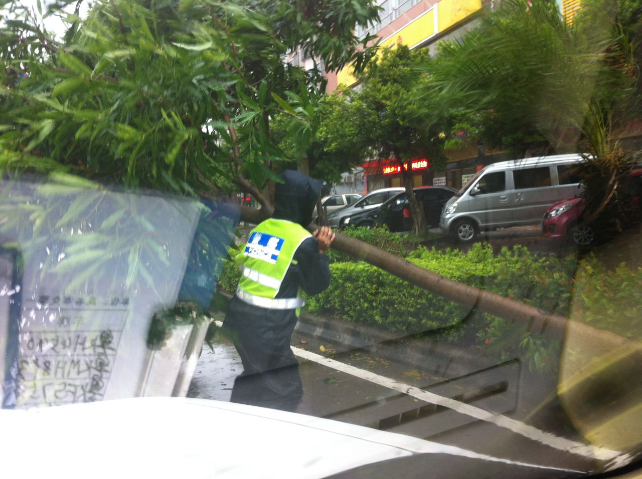 你给那几千块一个月我,我风雨不改,天天守在路上,看是否有砸木害民,并第一时间与伙伴们搬移树木。