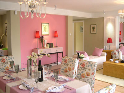 浅粉的墙与深色的地毯的反差,很抢眼。