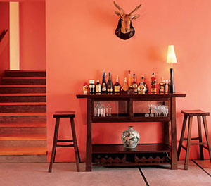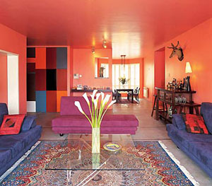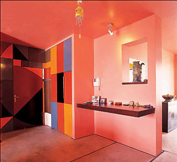 红色的顶棚与墙面,打造了一个整体的视觉空间。