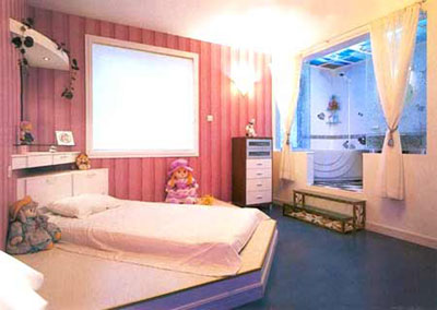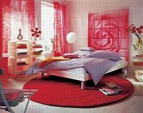 红色的地毯、窗帘、墙面装饰给整间屋子带来了全面的立体感。