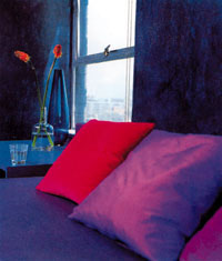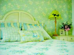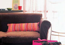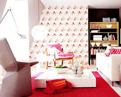 一面花花墙,红色地毯,粉色靠垫,白色沙发。经典!!
