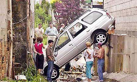 7月5日凌晨,沿成都市三环路由南向北行驶的一辆红色富康车,由于车速过快,在下大观立交桥时,撞上超车道隔离护栏,继续向前行驶,从绿化带上低飞约80米,撞上辅道护栏,接着冲上人行道将一株直径约15厘米、高8米的绿化树连根撞起,又向前冲了约6米,撞上路灯电杆,巨大的冲击力让富康车立即绕成一个圆圈紧紧抱住电杆,车内两男子当场被缠死……