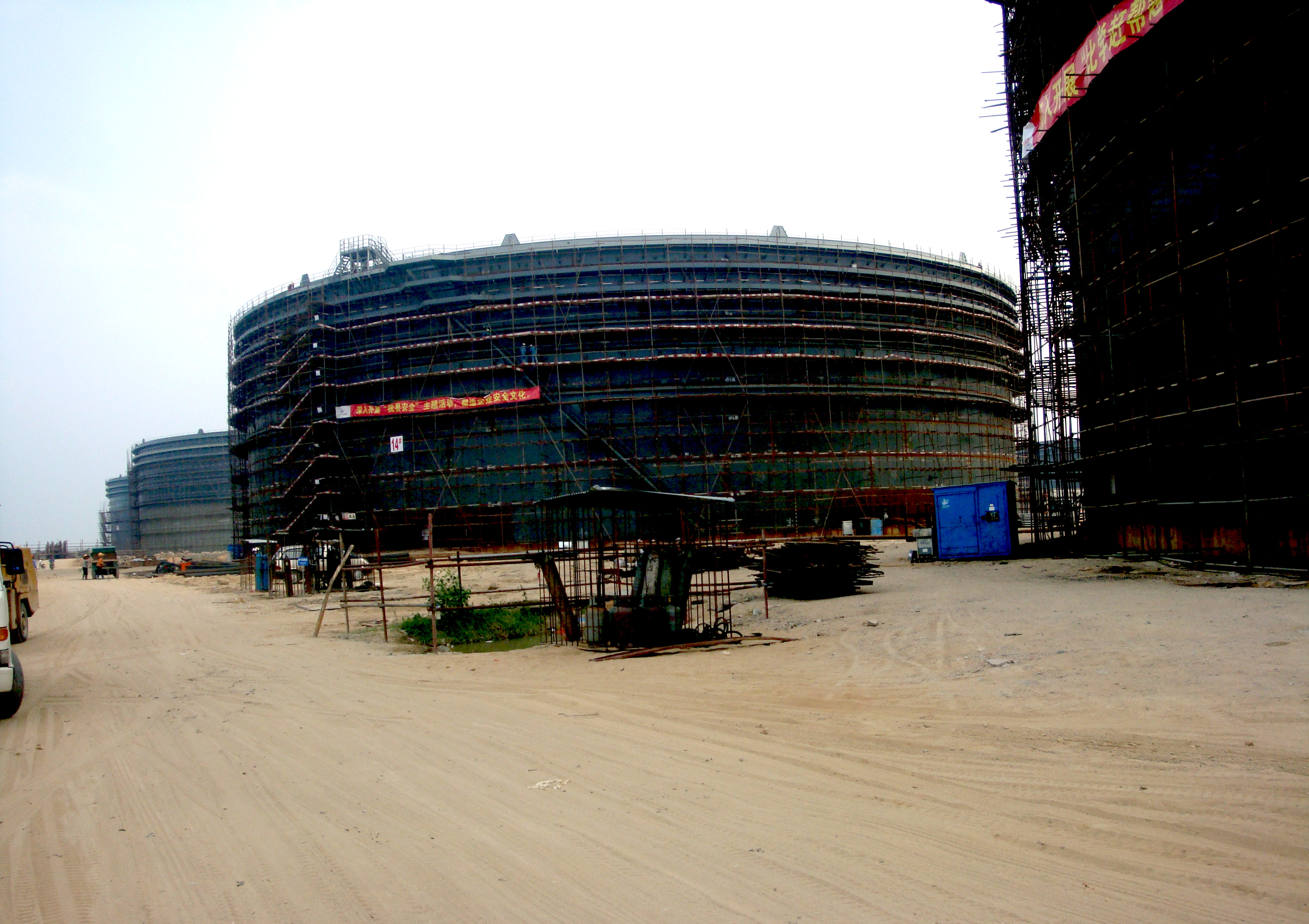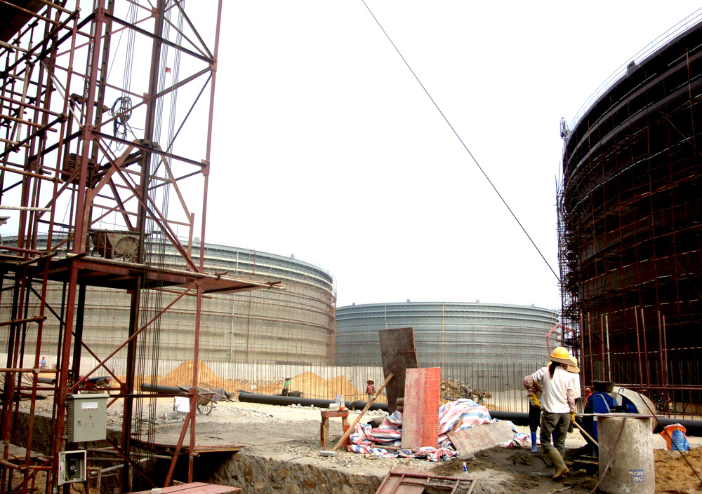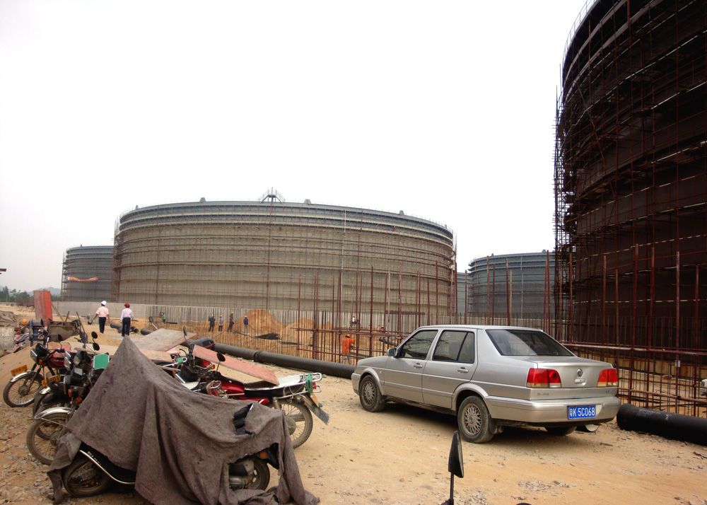 爵山北山岭油库,每个罐容10多万吨,叹为观止。