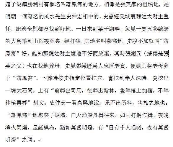 [FONT='&#23435]嬉子湖倮村有名叫落PC的地方,相魇英家的祖ž地,是明朝一有名的L水先生史仲宏相中的。史曾受城Y魏姓大财主重托,跑遍全h都]找到好地。一日淼讲俗雍畔,忽一b五彩缤的大B落到山擦盅Y。打,其地名叫燕C地,史f不如就叫“落PC”好。l知那魏姓财主嫌地不好而放。其rF匠(魇英之父)也在找地葬母,史F匠人忠厚老,便衿浣老母葬于“落PC”。下葬r按史指定位置挖穴,挖到半人深r,竟挖出一K大石,上有“前葬出司R,後葬出翰林,b使咨霞庸祝不室乒自僭”刻文。史仲宏一看高d地f:果不出所料,将相之地也。“落PC”地Ž菜子湖žI,白天O船舟楫往恚如同打躬作揖,夜晚O火Wq,星_棋布,q如fK明簦有“日有千人唱喏,夜有fK明”之佟。[/FONT]