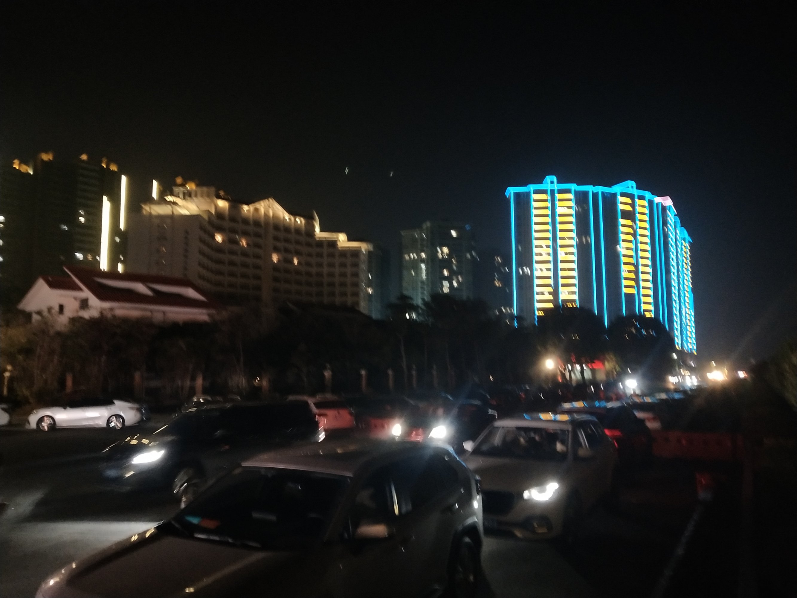 没看上面?原则上没有开通,还在施工安装路灯便道铺设、、两边还有水槽铁马栏着,但已临时停满车辆,车水马龙,人流车流,川流不息,车灯闪耀、、