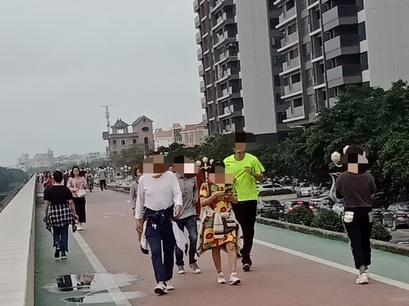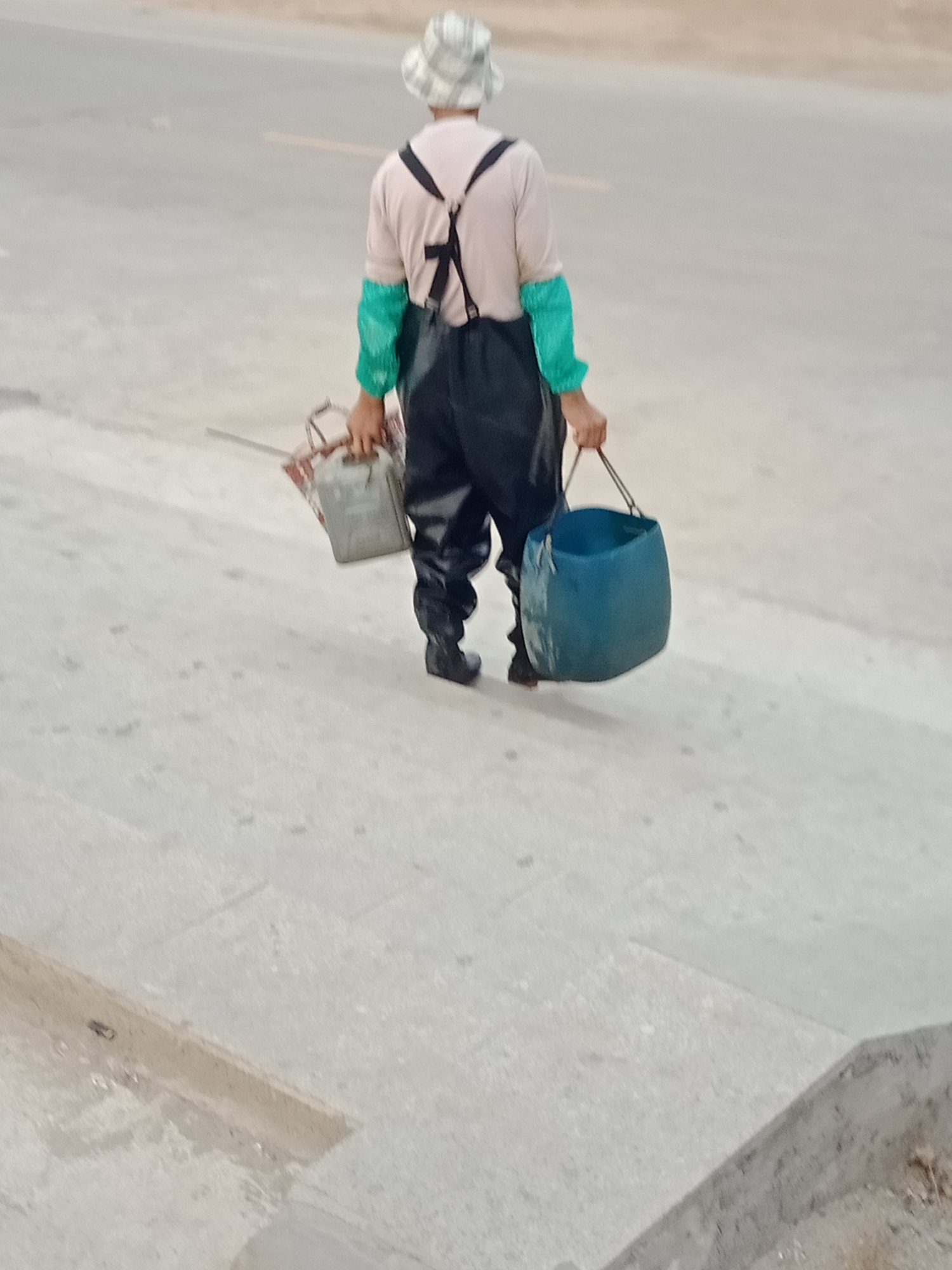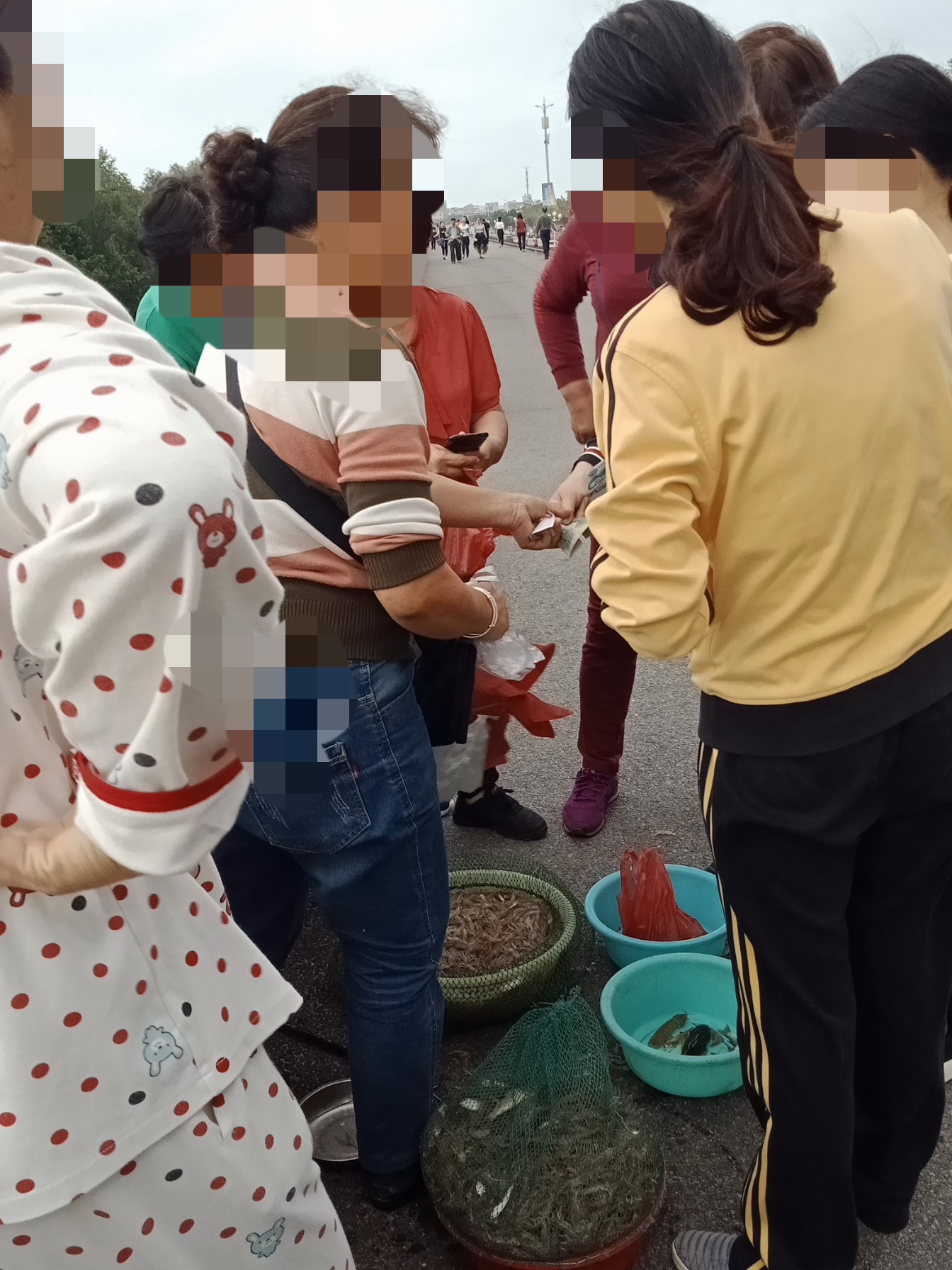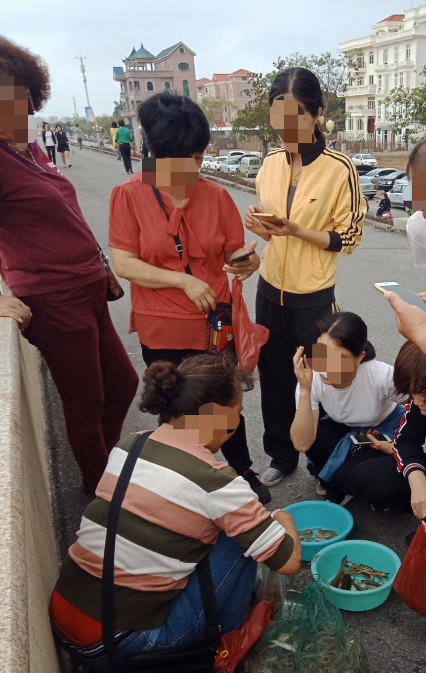 向着油地公园那边跑去,半路,见有好多晨跑运者围住~好奇走近一看,听闻是趁海人,上来这,准备将远海收获送去市场内贩或买?在这就有好些人帮衬了~听闻(有录到音频),单独虾或全部杂物都三十块钱一斤(还说市场要买三十伍块钱一斤,不知有骗人婆?),并说只收现金,没手机也不懂收微信付款~不过也有好多人买~