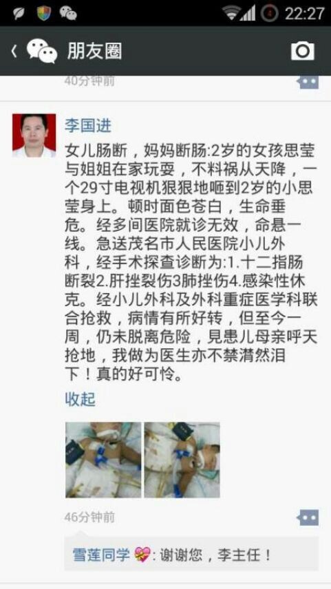 QUOTE(大树上的猴子 @ 2014年08月06日 Wednesday, 11:05 PM) 能力有限,表示一下好了! [snapback]3683061[/snapback] 谢谢您,同时也感谢手术主刀医生李主任给我们发朋友圈募捐
