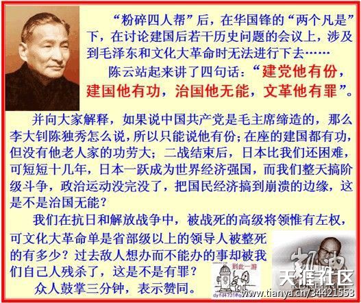 原帖第一段:在一次会议上,ZG元老之一的陈云讲了一句话来评价毛泽东一生的功与过。他说,毛泽东是“建党他有份,建国他有功,治国他无能,文革他有罪”。
